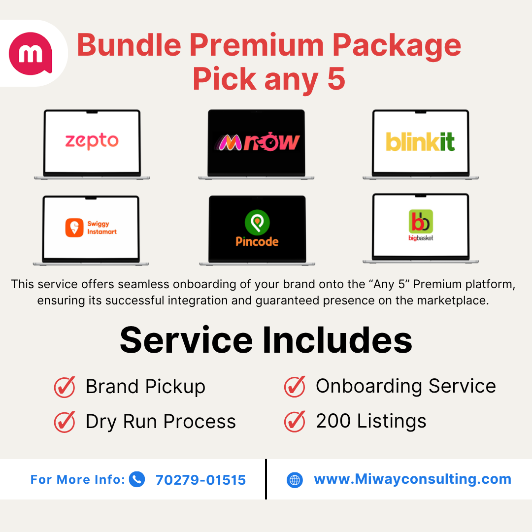 Our Bundle Package helps your brand get listed on six leading premium marketplaces at a price of 5 including Blinkit, Instamart, Big Basket, Zepto and more.
